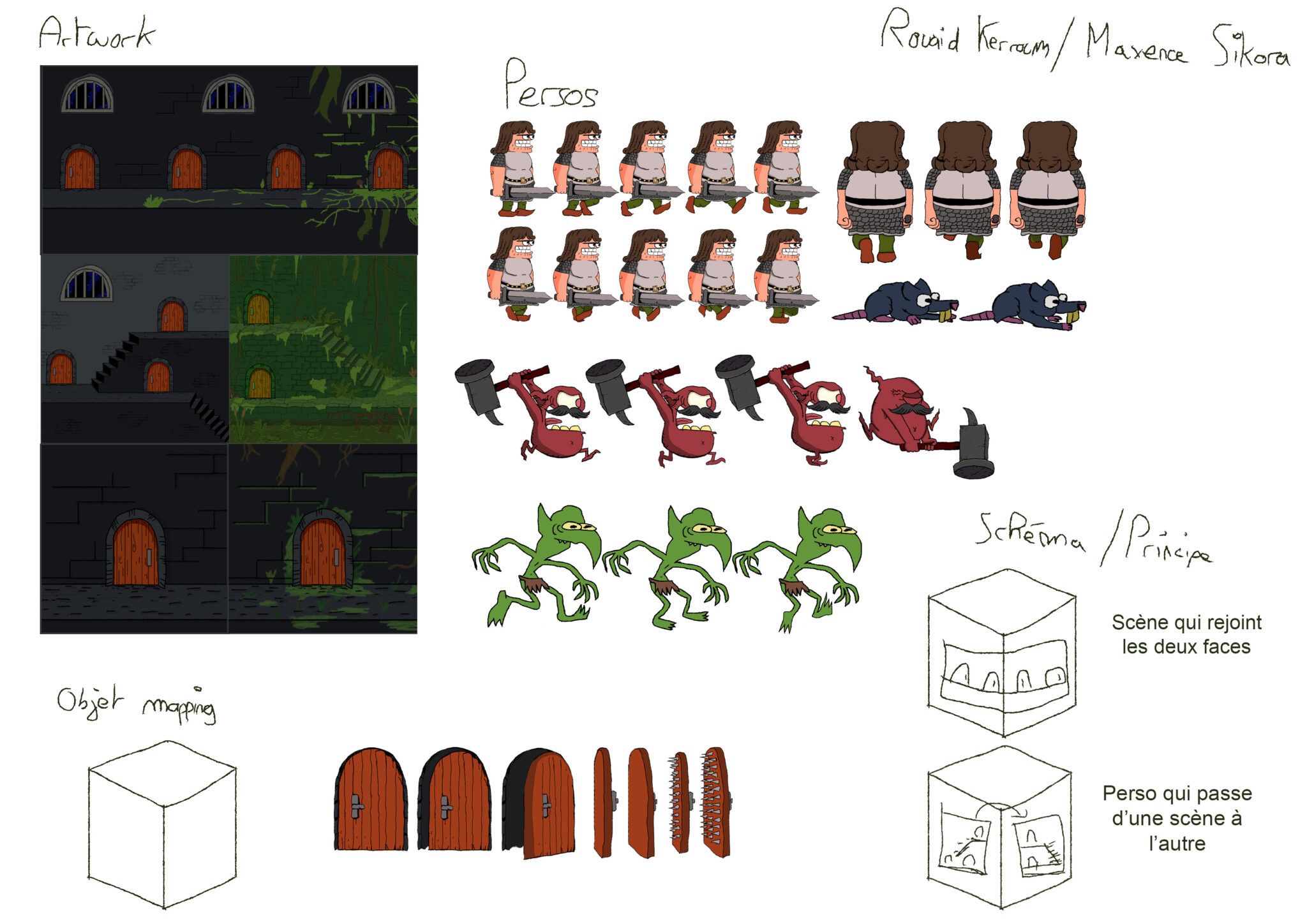Je met ci-dessous les différents décors réalisés sur photoshop, ainsi que les personnages avec chacune de leurs positions et autre.